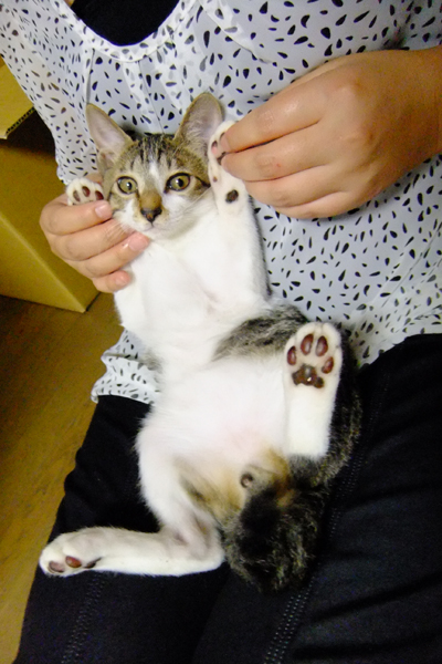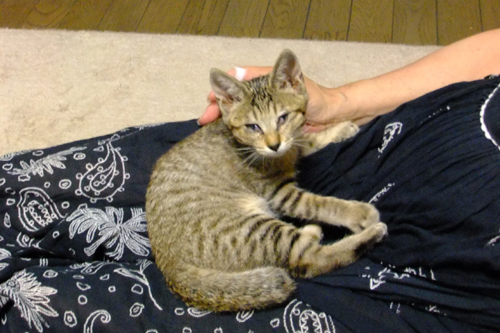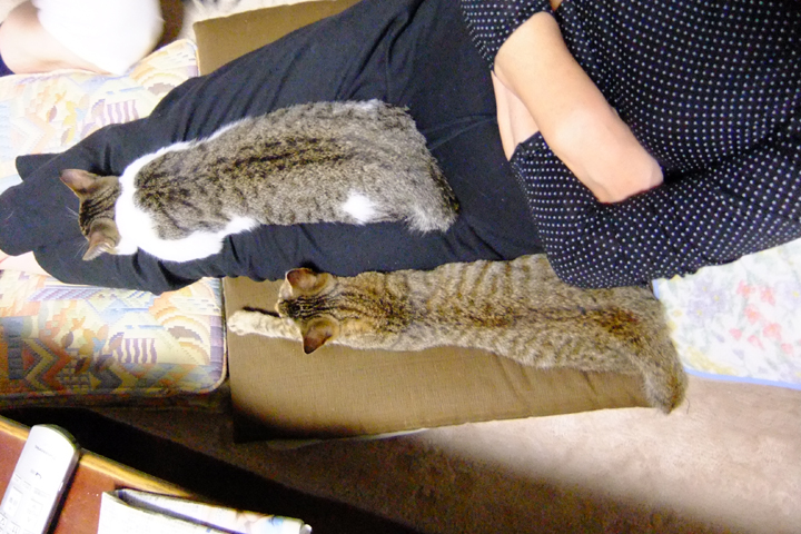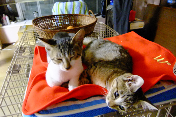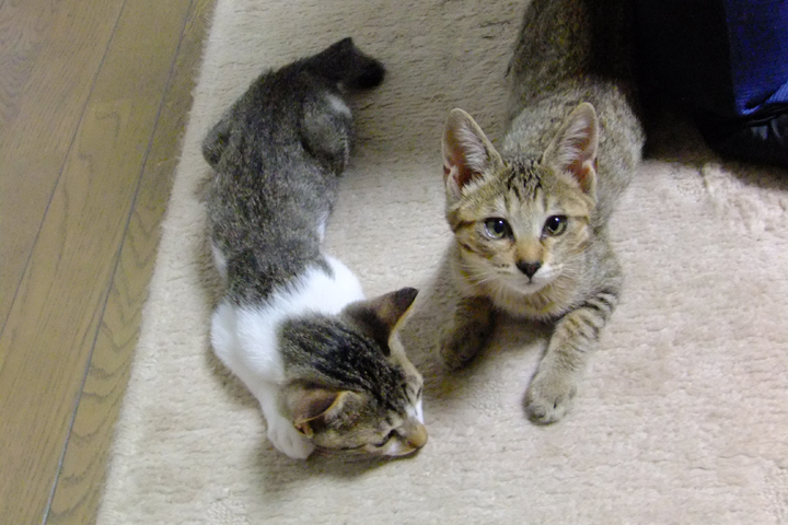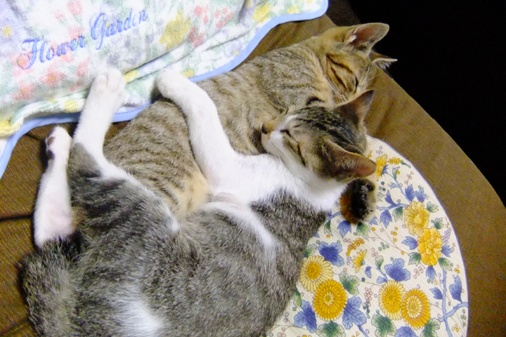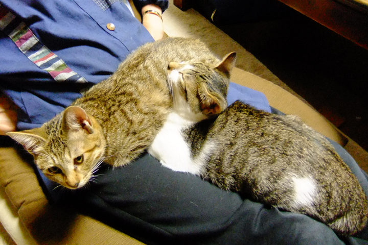 最初にうちに来た日は、ミーコがシマに「シャァッ」と威嚇しまくってて、どうなることかと思ったのですが、翌日から一緒に寝たりしてました。